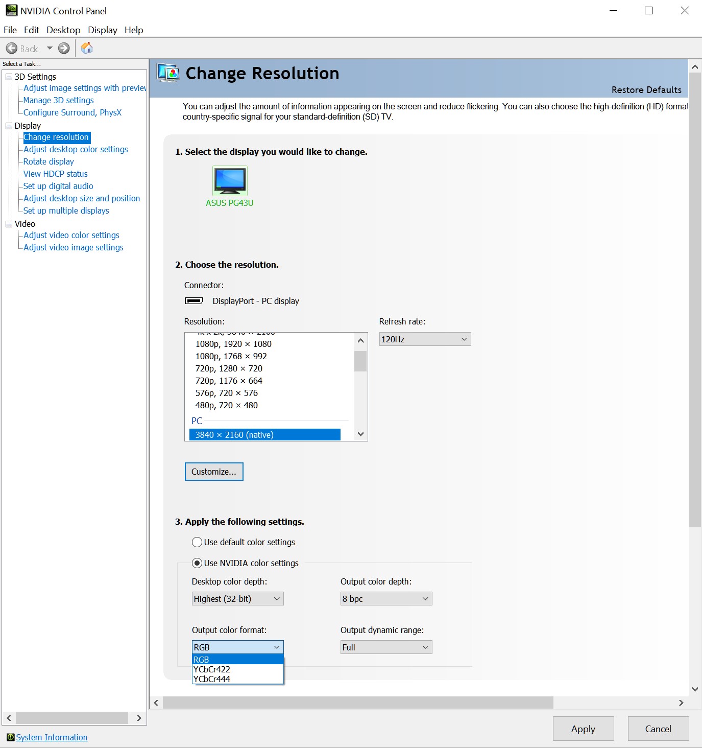 Recently I bought ASUS PG43UQ. By specifications the monitor is 43-inch 4K (3840 x 2160) VA with 144Hz refresh rate and support DSC (Display Stream Compression). Unfortunately, my current video card is Nvidia GTX 1080 (with updated DisplayPort 1.3 / 1.4 firmware), but I can’t use the full potential of the monitor, because the card does not support DSC. Currently I’m stuck at 4K/144Hz/8bpc/YCbCr422. The chroma subsampling is really annoying in Windows and I’m traying to set the monitor to 4K/120Hz/8bpc/RGB. Even the option is available and selectable in the drop-down menu of the Nvidia control panel, when I hit the Apply button the screen just goes black and after that noting is changed – settings are still 4K/120Hz/8bpc/YCbCr422. The same thing happens when I try to set the resolution to 4K/98Hz/10bpc/RGB. As I know, there is supposed to be possible to set the monitor to this setting, but in this case the 10bpc option is not showing in the drop-down menu of the Nvidia control panel (its achievable only in 80Hz).