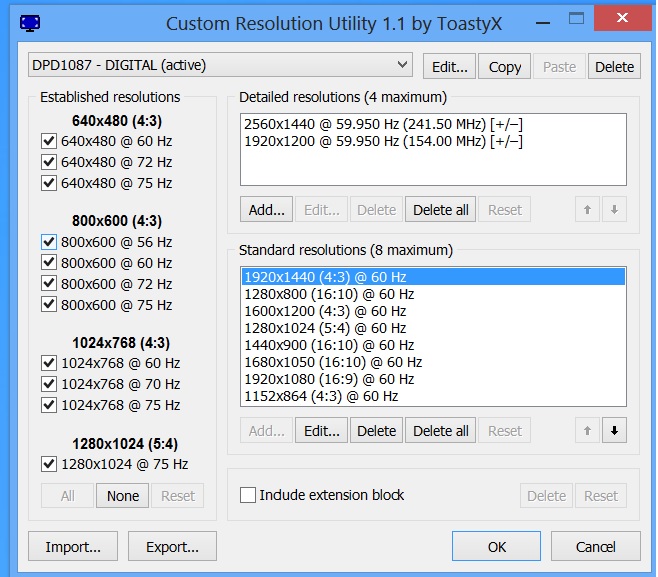 (10-03-2013 09:03 AM)niccroetger Wrote: Ok even from a clean install of windows, the only driver I installed is catalyst 13.9 (downgraded from 13.10 Beta too see if that was the problem). The same problem persists with no variation from before.No, you already covered the basics. This should be as simple as patching the driver and adding the refresh rate with CRU. Something weird is going on here. (10-03-2013 09:03 AM)niccroetger Wrote: What will happen if I modify the default 60hz entry for my monitor or is this an absolute contraindication.You can edit the 60 Hz entry, but you'll need to keep something under 330 MHz pixel clock for driver updates so the unpatched driver has a resolution to use. (10-03-2013 09:03 AM)niccroetger Wrote: I also noticed that inside catalyst I can set my monitor to a refresh rate of 75hz (but the only default profiles in CRU for me are 60hz at 2560x1400 and 1920x1080)You shouldn't be able to set 75 Hz if it's not listed in CRU. 1920x1080 shouldn't be listed in CRU either. Did you add it or was it already there? The QNIX can't handle anything other than 2560x1440. |