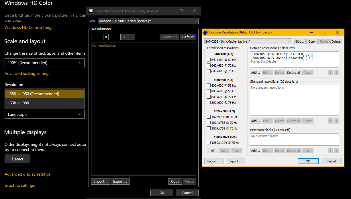 (03-24-2023 04:32 PM)Rstudio Wrote: There was a way ( not working anymore it seems ) to edit registry to add custom VSR res with refresh rate editing DALNonStandardModesBCD1 key (https://forums.guru3d.com/threads/how-to...ls.397985/)That is the method SRE uses, but the refresh rate part has no effect for VSR or scaled resolutions. |