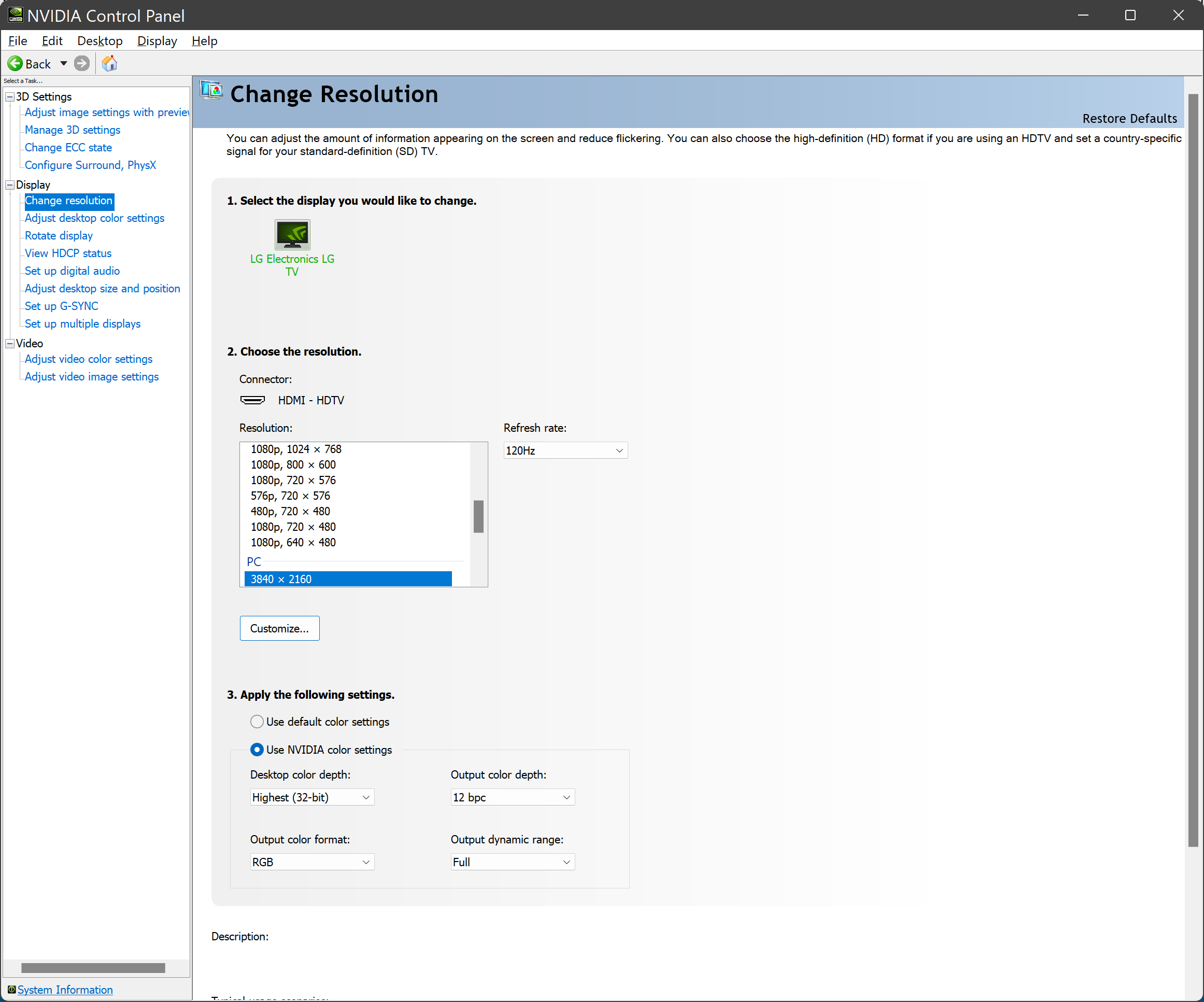This is with scaling set to "monitor" in the drivers. With scaling set to "GPU" it adds even more of these scaled resolutions, with every EDID resolution available in GPU scaled 3840x2160 at every refresh from 23Hz to 120Hz, but that is expected behavior for that setting. With "monitor" scaling enabled, the driver switches to some sort of pre-defined list of scaled resolutions expanding on the EDID resolutions by adding certain refresh rates. For example, the TV supports 640x480 60Hz, 1024x768 60Hz, and 2560x1440 120Hz. All three of these appear in the PC section. However (with monitor scaling) in the HDTV section the following scaled resolutions related to them also appear: 1080p, 640x480 (100Hz, 119Hz, 120Hz) 1080p, 1024x768 (100Hz, 119Hz, 120Hz) But no scaled version of 2560x1440 since it already goes to 120Hz in the EDID. This makes it very difficult to play old games at low resolutions like 640x480 with monitor scaling unless the game is able to select the 60Hz mode directly, in most cases the game will launch in 640x480 120Hz in scaled 1080p. At first it seemed like some sort of driver feature Nvidia added to try to preserve the native refresh rate at all times by finding the resolutions the TV can do at 120Hz and scaling to those resolutions whenever possible. However, then I noticed there are various other scaled resolutions at 60Hz as well, such as: 480p, 720x480 60Hz 720p, 1280x720 60Hz So it actually seems like there is just a list of various forced scaled common resolutions at 480p, 720p, and 1080p to "fill in the blanks" of whatever the EDID doesn't have and the 1080p ones just happen to go to 120Hz on my display and probably wouldn't appear otherwise. If i delete 1080p greater than 60Hz with CRU I assume 640x480 60Hz will start working as default, but I prefer to keep 1080p 120Hz. Is there any way to delete these remaining scaled resolutions? Attached a picture showing the issue. EDIT: Nevermind, I just remembered Nvidia always listed certain resolutions such as 720x480 and 1280x720 in the HDTV section instead of the PC section over HDMI, so those are the normal EDID resolutions. Looking over the list, the only issue is that due to the presence of 1080p at three high refresh rates in the EDID, scaled high refresh rate versions of every resolution below 1080p are appearing. |