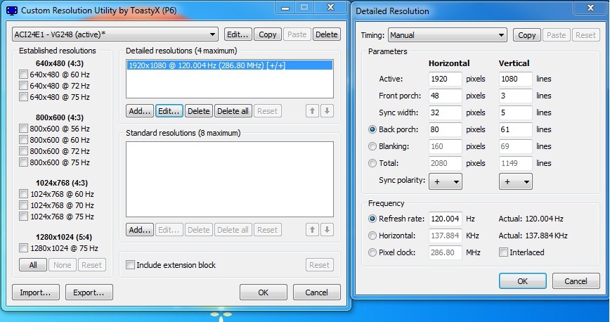 (01-02-2014 02:47 AM)DanaG Wrote: Okay, this might be somewhat off-topic, but it may be possible to sniff what registry changes that Intel tool makes, and then incorporate them into StrobeLight.How did you initialize the monitor? Simply adding custom resolutions is not enough. LightBoost has to be unlocked first. |