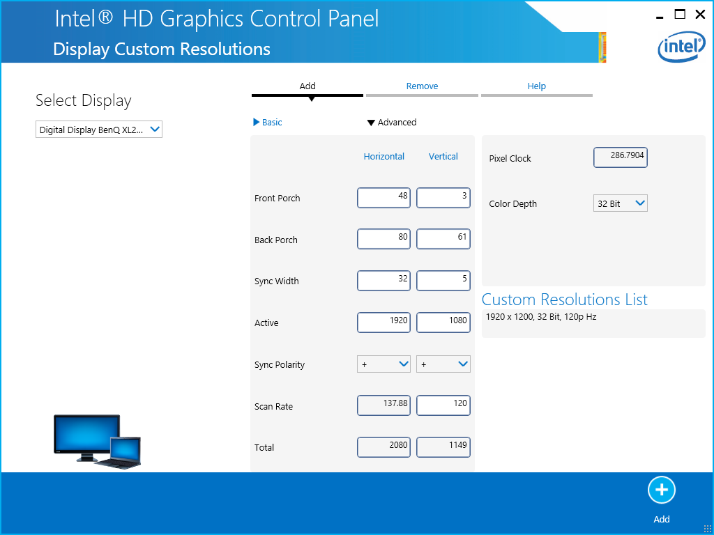 I just had to run c:\Windows\System32\CustomModeApp.exe (part of the Intel driver), and add a mode with the correct settings. Original source for the values: http://www.blurbusters.com/?attachment_id=1148 The "scan rate" field is poorly designed -- only the "vertical" portion actually accepts input, and once you enter a number, the "horizontal" portion then gets auto-calculated. Once I added the custom mode, I went to device manager and disabled, then re-enabled, the Intel video card. A reboot likely would've done the same. Finally, I went into the Display control panel, and selected that new 120Hz mode. EDIT: Okay, this might be somewhat off-topic, but it may be possible to sniff what registry changes that Intel tool makes, and then incorporate them into StrobeLight. |