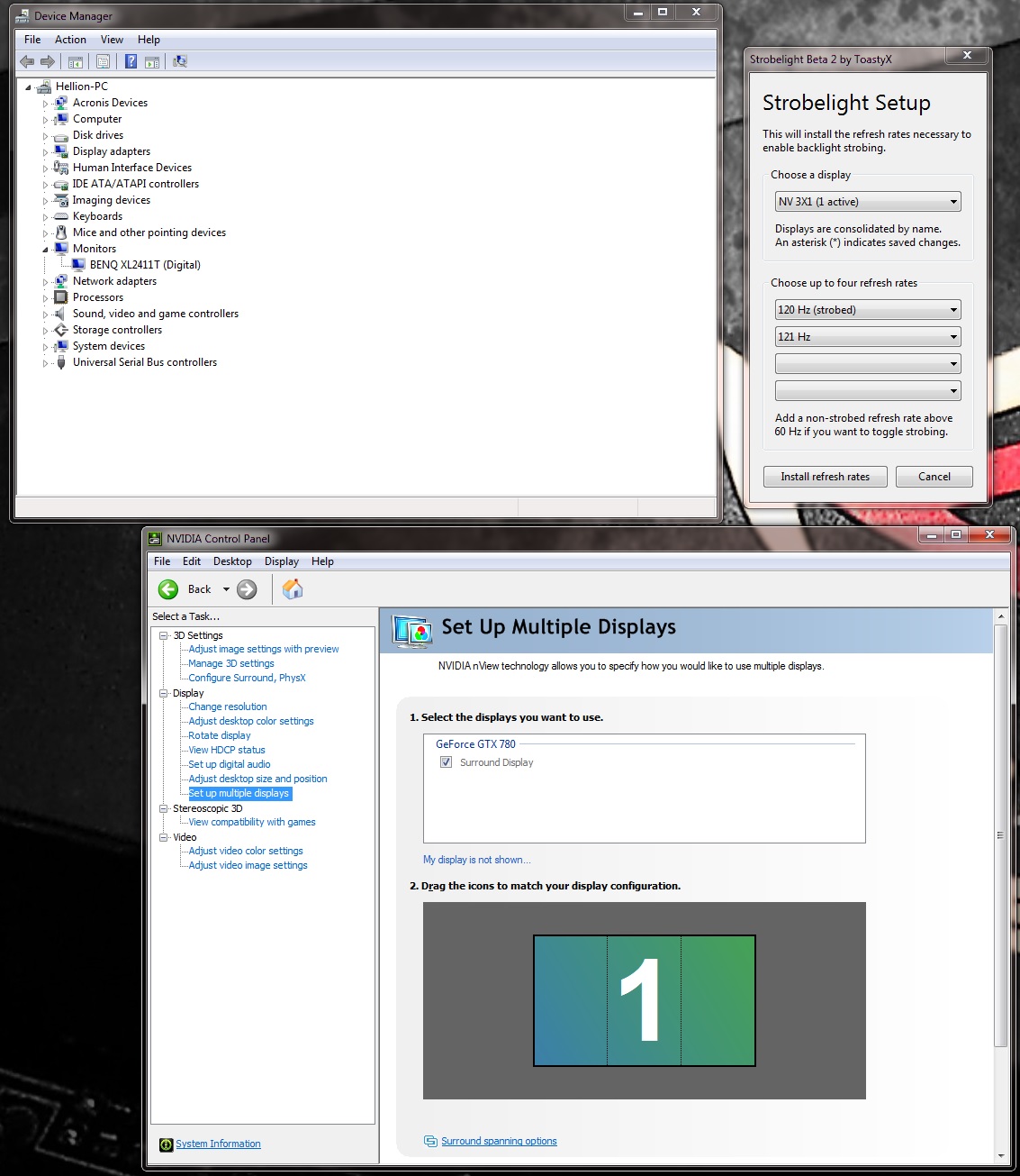Just reseted all entries and reinstall strobelight same. Here is the surround crap nvidia thing(thumbnail) Ill reinstall drivers now in order for driver to read the monitors again. ToastyX more feedback... Unistalled everything used also Driver Sweeper to be sure Reinstalled clean 341.40 without geforce Experience Rebooted Strobelight configuration utility run this what i get [Image: http://imageshack.us/a/img11/5756/v85d.jpg] So i choose BenqXl2411t not Nv 3x1 to setup Reboot.Works on 1 monitor 3D mode Go to surround enable surround this is the weird thing now All monitors enable go to gaming mode but the middle one(original with 3D installed) has a flicker effect which is quite obvious. I go to your taskbar reinitialize monitors with strobelight and all go in 3D mode.By the way now in nvidia control panel>change resolution i have 3240*1920 and i can select 120-121hz which are the strobbed non strobbed. Of course im not happy at all when i reboot it will remove those two entries and will have 60-144hz all non strobbed and override ur tool. Any thoughts? |