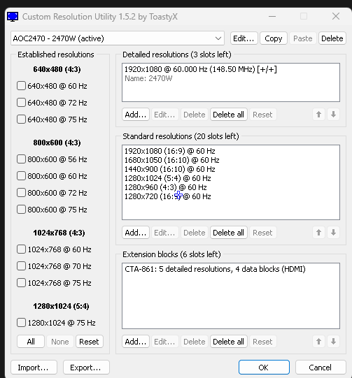 im trying a method for stretch res on games and a step is thta you copy a resolution underneath extension blocks but i have a problem, there is no resolutions on my main monitor but there is on my 2nd monitor and i dont want to use my 2nd monitor, i will provide a photo of my main monitor compared to my 2nd monitor Msi being my main 144hz, 2470W being my 2nd 60hz