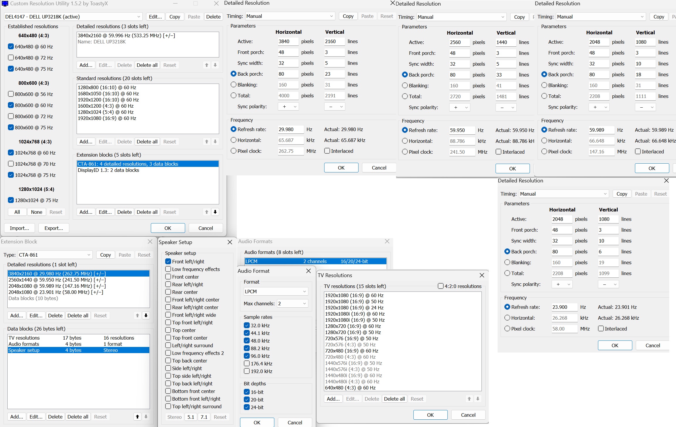 I am hopeing you could help me with understanding what i need to do to achive a resolution of 5760x4320 over two displayports @60hz so 2880x2160 over dp1+dp2 on the up3218k I did use the SRE to get 2880x2160 I also tryed the CRU to get 5760x4320 with no luck i understand that this has something to do with the extension blocks and this is where i am confused, what do i need to do in this extension block to achive 5760x4320 I am on Nvidia rtx 3070TI visual step by step examples would be helpful as i can copy your results. Thank you edit - If i only use one of the display port i can access the extention block information however this only works for one of the dispayports not both dp1 or dp2 and together. i again tryed adding 5760x4320 and 2880x2160 to the extention block edit and did not give me 5760X4320 what am i doing wrong are the lines or the mhz the problem here should i remove everything and only add what resolutions i want to achive to both dp1 and dp2 without nowing the details eg pixels lines mhz ect |