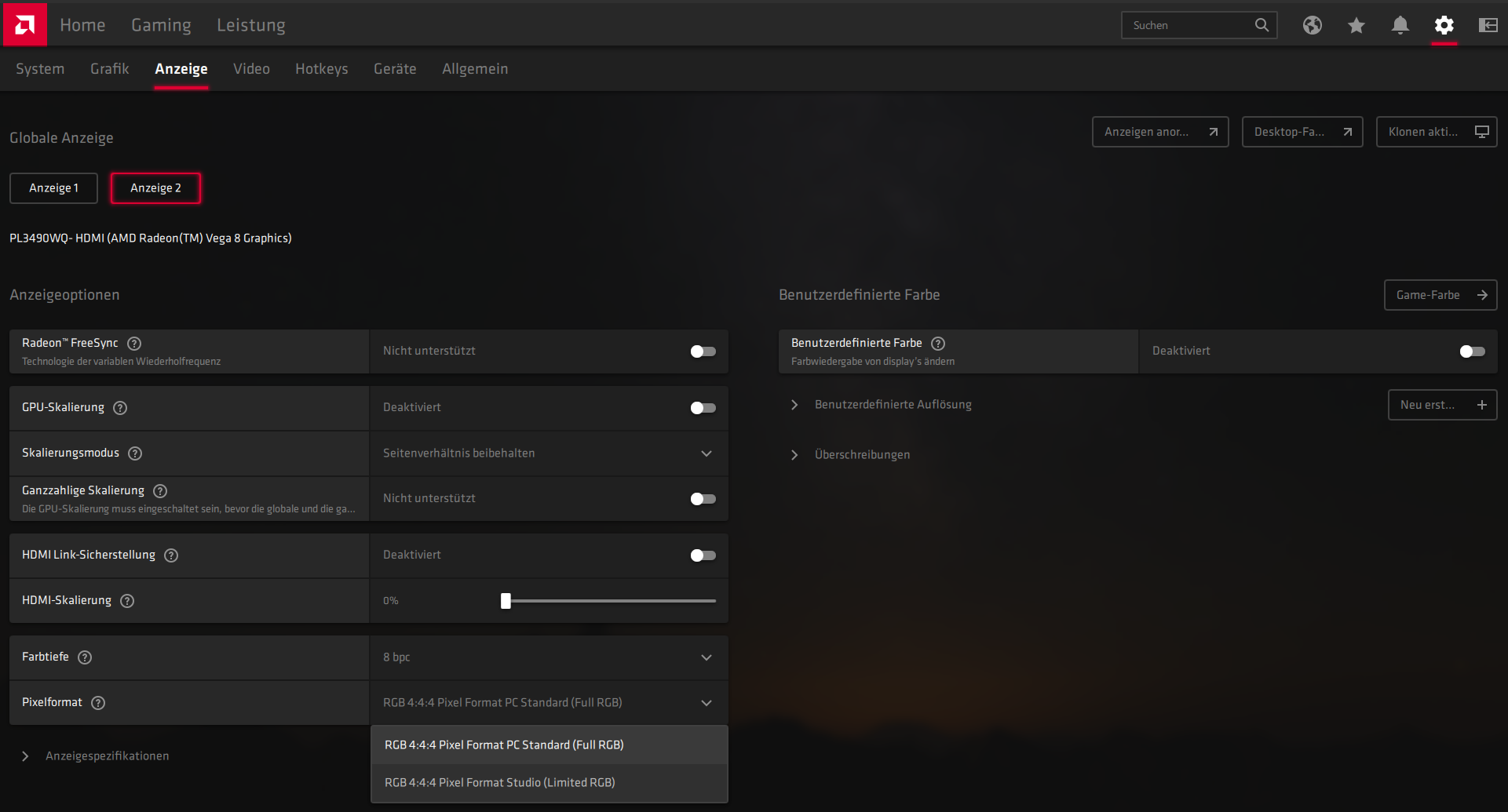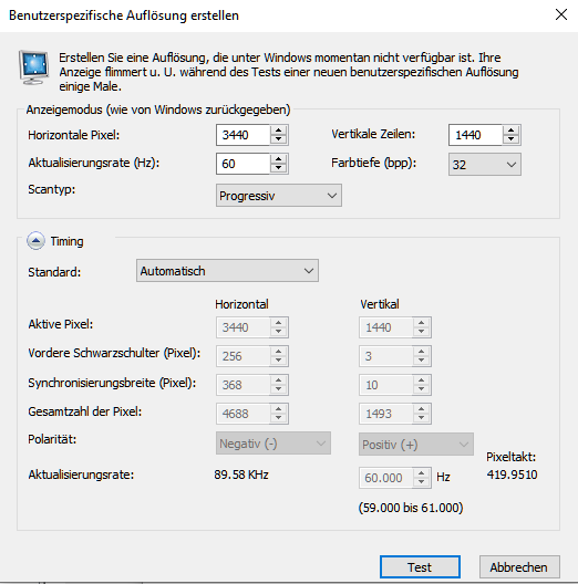 (04-25-2020 09:16 PM)Nintendo Maniac 64 Wrote:(04-25-2020 10:31 AM)olco Wrote: I am using the same input of the monitor and the same cable which works for my desktop pc, but I only get 30Hz. I can't set 1920x1080@60Hz as custom resolution. I get the same error message as when I am trying to set 3440x1440@60Hz as custom resolution. I am not able to set subsampling to something different than 4:4:4 via the amd software. Even if I am setting 8bit colour instead of 10bit, there is still only 4:4:4 to set. If I try to set all the timing options to the same values, that work for my 980ti on my desktop pc, I still get the same error message. Trying to change something via CRU, for now I just managed to delete 3440x1440@30Hz. Was able to select it again via windows settings after executing "reset-all" but wasn't able to add it manually. |