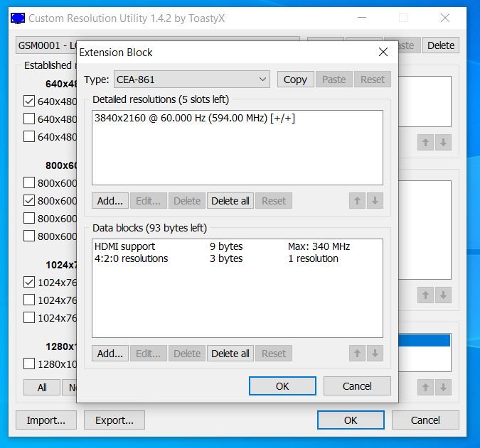 Yes, delete the default extension block with CRU. Why do you have three extension blocks? Why did you delete the detailed resolutions? Where is the HDMI data block that I told you to add? You need one extension block with HDMI support and 4:2:0 resolutions. You need one detailed resolution to define the native resolution.