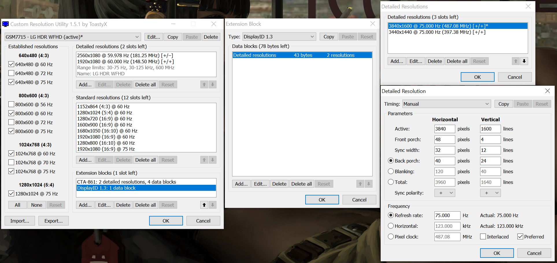 I own an LG 29WK600 monitor, 29inch Ultrawide ""HDR"" FreeSync, connected to an RTX2080S via DisplayPort, that works with a native resolution of 2560x1080 75Hz. I had a little experience with CRU in the past, boiling down to successfully tinkering with refresh rate overclocking on old monitors, so, naturally, my first thought when this new one arrived at the time was to try and do that again. Unfortunately though, ANYTHING above 75Hz results in no image, but that's completely fine, 75Hz for non competitive stuff is more than acceptable. Moving on, one day I'm searching for reviews and tests, looking for some base picture settings, when I stumbled upon a review mentioning two other, bigger monitors, but sharing the same design characteristics (I can't remember the models), but they had bigger resolutions. Out of the blue, I had the idea to create a custom resolution, starting at 3440x1440 60Hz, and for my surprise, it worked... image came on, no glitches, no flickering. Then I went for 75Hz, and, it worked, again... At this point I wasn't entirely sure anymore of what I was seeing. Image was spotless, movies, games, whatever, ran frame skipping tests, and some other tests from the TestUFO website, but I honestly have no idea if they would've shown anything. After that I went for 3840x1600, 60 and 75Hz, and both worked as well, could also still select 10bit on nVidia Panel and enable the ""HDR"" through Windows 10 and games, it is working just like native. Well, I ran all the tests I could think of at that time, but not having a ton of experience in the matter still made me take these results with a grain of salt. Ok, from what I understand, CRU actually ADDS resolutions, and, if the monitor can't, it simply WON'T show any image without a working setting, is that correct? My main question is: is this monitor really working at higher resolutions? Or could be some kind of "gimmick" going on that could act as if it were working fine? I really don't know what to think lol, I'll attach a few images with my settings, any input is much appreciated. The DisplayID 1.3 block I added manually, along with the two resolutions. Thanks in advance. --Edit-- Forgot to mention that I also edited the Range Limits: Freesync range was 40-75, the other one was 90-90kHz and the last one was at 240MHz stock, I believe. |