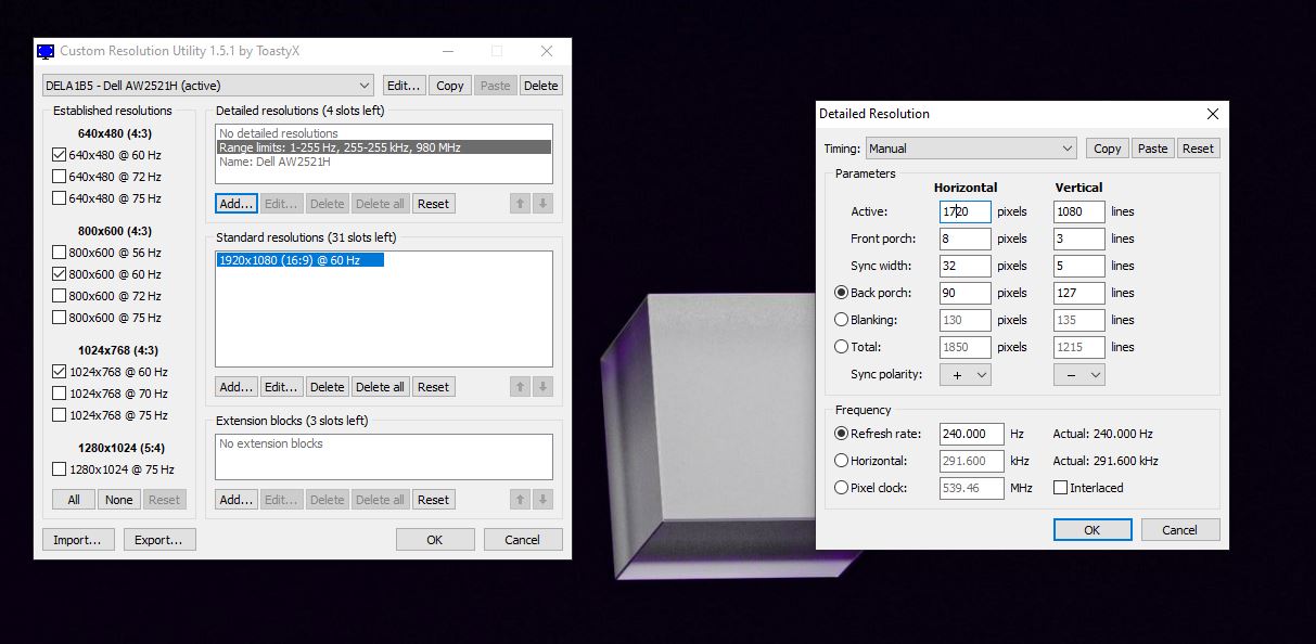 My monitor is a Alienware AW2521H 360hz & and I'm trying to create a custom res of 1720x1080 @ 240hz. 1. First I open NVIDIA control panel turn on display scaling with no scaling mode selected. 2. I opened CRU and I copy the 240Hz detailed resolution from the extension blocks, then I delete all extension blocks. 3. I delete all detailed resolutions, add a new 1720x1080 resolution with the details I copied. 4. I add a standard resolution of 1920x1080 @ 60hz. Click OK. 5. I run Restart64.exe. My display is now running 1920x1080 @ 60hz. 6. I open display adapter properties, list all modes, then I select the custom resolution I added, click apply. The screen goes black for 10 seconds then comes back still on 1920x1080 @ 60hz. What is going on here?? If I go to Windows display resolution it says my recommended is 1720x1080. I can change to this resolution on get black bars on either side but I'm still on 60hz. If I change to 240 Hertz in Window display settings I get a black screen & have to enter safe mode to fix. Any help would be much appreciated? |