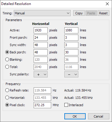 (09-18-2022 02:05 AM)egagah Wrote: I have dual monitor setup and RTX2070super as below:Normally for the GPU to clock down with multiple monitors, both monitors have to be perfectly synchronized so the vertical blanking periods happen at the same time, but this is hard when the resolutions don't match. I don't know how it clocks down at 59.951 Hz because that doesn't match the other monitor exactly. Freezing would be an NVIDIA driver bug, but that might be happening if the monitor isn't staying connected properly. If the PRISM+ can't handle custom parameters, that makes it much more difficult to synchronize both monitors, and I can't even guarantee synchronizing them would allow the GPU to clock down because the driver might not handle all cases where the resolutions are different. If the PRISM+ can handle a very slight tweak to the timing parameters, making all the parameters and the pixel clock a multiple of 4 would allow making a 1920x1080 equivalent by multiplying the parameters by 0.75 and the pixel clock by 0.5625. Technically these two are perfectly synchronized: You should also check the TV resolutions and delete 1920x1080 @ 120 Hz if it's in there. I don't know if that's enough blanking for the GPU to clock down, but if it isn't, I'm not sure what you can do if the PRISM+ won't accept higher vertical totals. |