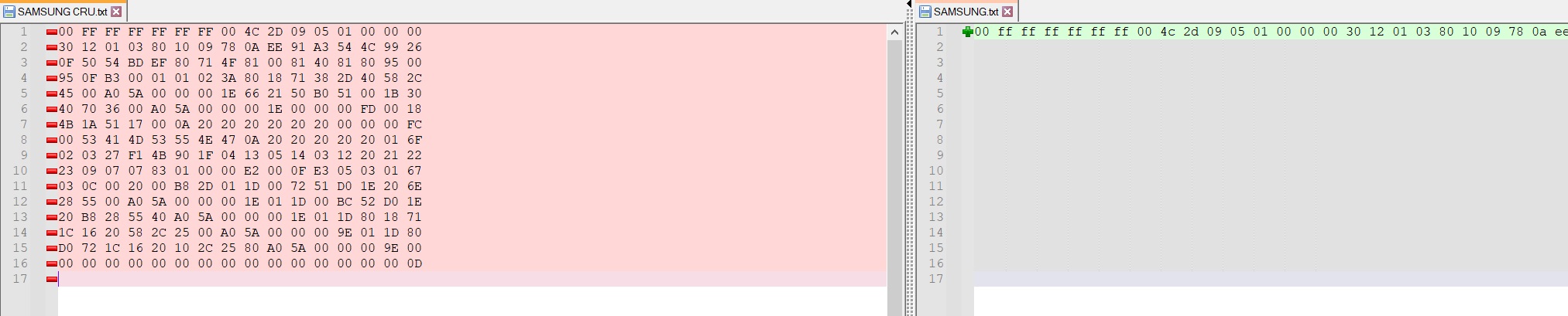 (10-01-2022 08:24 PM)Peppe90 Wrote: About this, do you suggest to edit the EDID file, then load it on Nvidia CP, or should I load it first then EDIT with CRU while Windows is seeing it as a already connected monitor?It would be better to load the modified EDID using the NVIDIA control panel because that's more direct. Too bad they only offer that for Quadro cards. (10-01-2022 08:24 PM)Peppe90 Wrote: It is the EDID of a display a fixed file? I'm asking because on CRU I have i.e. 3 times the edid of the LCD Tv (the Benq monitor I'm on now have even 4). Exporting them, they have 3 different MD5. Shouldn't they be the same? Perhaps if I connect the PC with different cables (or extracting using another PC) it could get a different EDID file?CRU should only have one active entry for each connected monitor. Inactive entries are leftovers in the registry from previous connections or different drivers. Keep in mind the registry only stores the first block, so CRU can't read extension blocks for inactive entries. If you see a "Default extension block" in the extension block list, the exported file won't have the extension block data. Each type of connection can have a different EDID. VGA will say it's analog. DVI will say it's digital. HDMI uses EDID 1.3 and has a CTA-861 extension block with an HDMI data block. DisplayPort normally uses EDID 1.4. The EDID for each port on the monitor normally does not change by itself, although some monitors might have certain settings that can change the EDID. Keep in mind any changes you make in CRU will appear in the exported file. If you didn't make any changes and the monitor is connected and recognized as active, then exporting a file will save the original unmodified EDID. (10-01-2022 08:24 PM)Peppe90 Wrote: I also noticed that exporting a EDID through Nvidia CP and CRU (both as TXT, since Nvidia CP only exports as TXT), the MD5 doesn't match.MD5 requires an exact match. The best way would be to compare the raw binary data, but the NVIDIA control panel only exports text files. The text formatting shouldn't affect the data as long as the hex values are the same. (10-01-2022 08:24 PM)Peppe90 Wrote: Last question: what's the reason i have to put that strange res. instead of just 720x480i / 720x576i?720x480i/576i is normally double-clocked, but there's no way to specify a double-clocked resolution in the EDID. 1440x480i/576i produces a similar signal that the TV can handle. The EDID stores the number of lines per field, so 240 for 480i and 288 for 576i. |