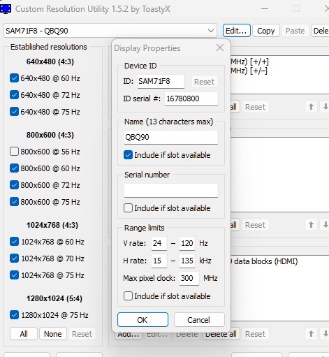 (03-27-2023 04:21 PM)ToastyX Wrote:(03-27-2023 10:16 AM)Just_Chert Wrote: Acer SA241YAbiI'm not sure what you're saying. You mentioned several things that have nothing to do with each other. Export a file using CRU and post it here. The thing is I try to add or edit a hertz frequency higher than 75 hertz, but the hertz profiles display in Windows 10 just does not change, just static display 4 profiles and it is 50/59/60/75 hertz, CRU settings are just ignored |