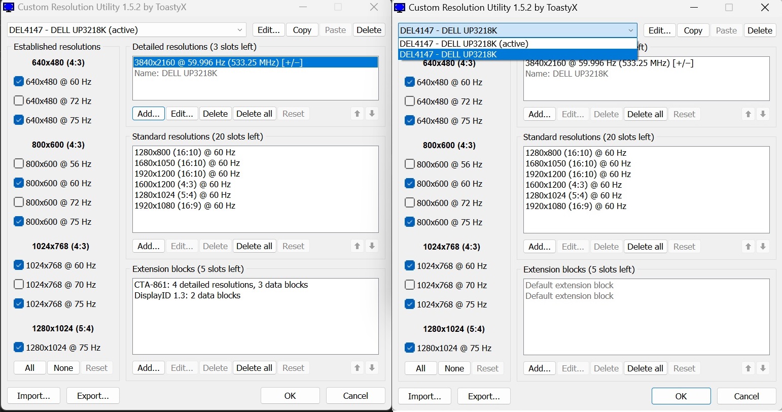 I am hopeing you could help me with understanding what i need to do to achive a resolution of 5760x4320 over two displayports @60hz so 2880x2160 over dp1+dp2 on the up3218k I did use the SRE to get 2880x2160 I also tryed the CRU to get 5760x4320 with no luck i understand that this has something to do with the extension blocks and this is where i am confused, what do i need to do in this extension block to achive 5760x4320 I am on Nvidia rtx 3070TI visual step by step examples would be helpful as i can copy your results. Thank you edit - If i only use one of the display port i can access the extention block information however this only works for one of the dispayports not both dp1 or dp2 and together. i again tryed adding 5760x4320 and 2880x2160 to the extention block edit and did not give me 5760X4320 what am i doing wrong are the lines or the mhz the problem here should i remove everything and only add what resolutions i want to achive to both dp1 and dp2 without nowing the details eg pixels lines mhz ect |
