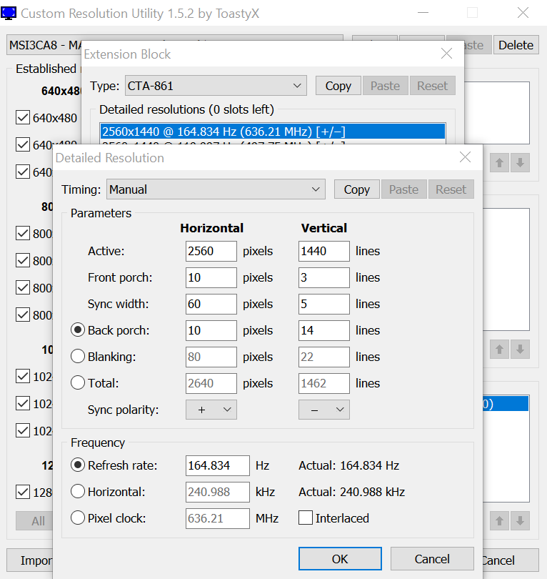 (03-29-2023 03:30 PM)PLU Wrote:(03-26-2023 09:43 PM)ToastyX Wrote: That's all you need to do to add the resolution. Make sure to delete the old resolution in the other extension block so that doesn't take effect.Ok so that was the issue and now it's applying, however if I edit the vertical blanking until it downclocks or use CVT-RB(2) it can go down to 200 Hz but the monitor starts to perform really poorly. There's a noticeable input delay and the refresh rate definitely isn't 165 Hz even if it's reported as such. I can't say for sure but it feels and looks like it's just 60 Hz. Even the UFO test says it's 165 Hz but maybe it's just reading what Windows is reporting. Hello! I have the same monitor and the same issue as you. Have you managed to find a solution? Thanks! P.S. I managed to make mine work at 155Hz with no apparent loss in performance, but it's the maximum before the limit hits. |