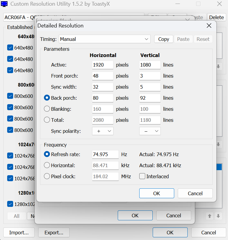 When deleting this CRU res and adding the same detailed res with nvidia custom resolution (CVT-RB 1920x1080 143.981hz in nvidia CP instead), i go into regedit: Computer\HKEY_LOCAL_MACHINE\SYSTEM\CurrentControlSet\Control\GraphicsDrivers\Configuration\ACR0742TH5AA0038521_34_07E4_11^CC793B8FD95ECAE1C053C2FC37090D8E\00\00 and it shows VideoStandard 3. i looked up what VideoStandard means. https://learn.microsoft.com/en-us/window...l_standard 3 = D3DKMDT_VSS_VESA_CVT 255 = D3DKMDT_VSS_OTHER to replicate, you might have to change your res to something lower, then back to the cvt-rb one in order to see the VideoStandard change between 255 and 3. CRU CVT-RB = VideoStandard 255, nvidia CVT-RGB = VideoStandard 3 (seems proper) so despite adding a 143.981hz CVT-RB resolution in CRU, the regedit in windows always only shows 255 as the VideoStandard whereas adding CVT-RB via nvidia CP as a custom resolution shows the proper VideoStandard being 3 which means D3DKMDT_VSS_VESA_CVT according to above microsoft link. |