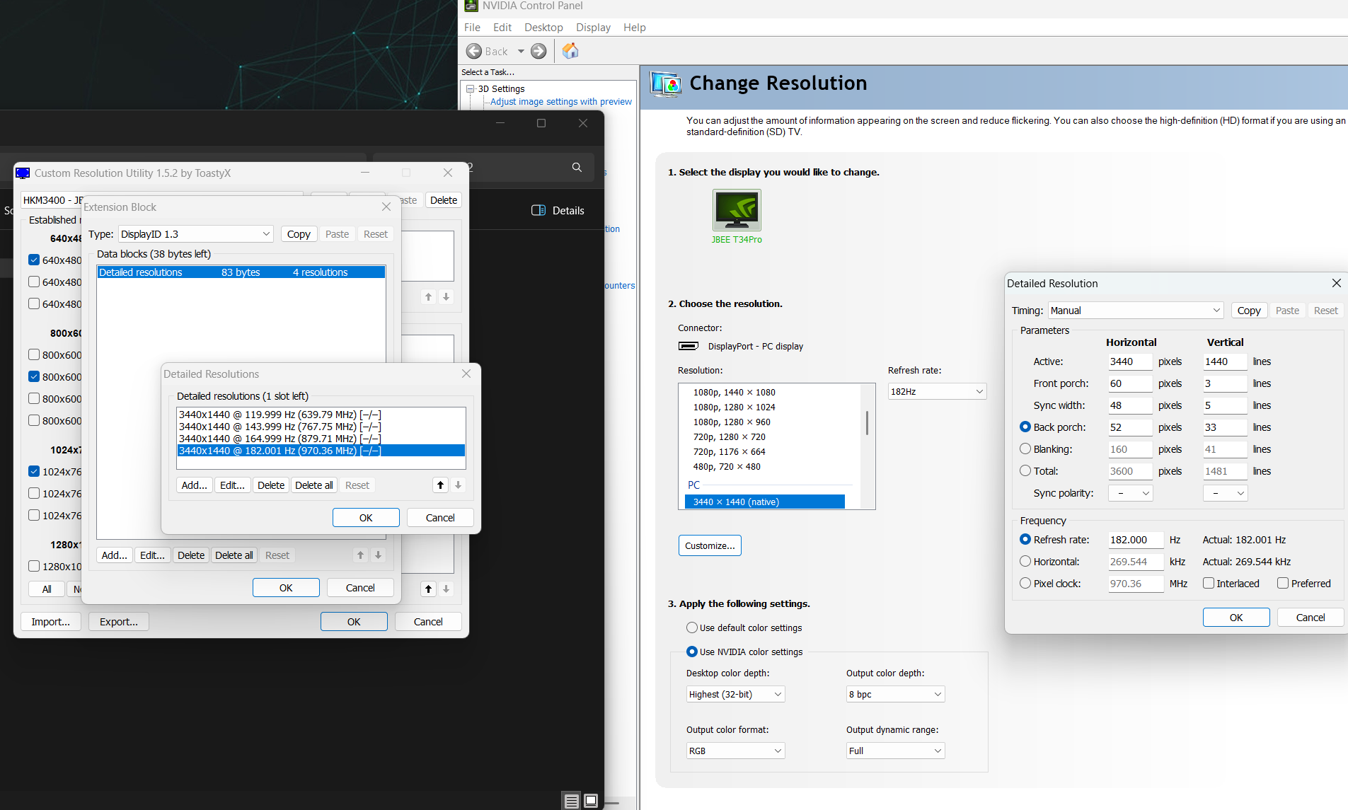 i was able to overclock further than my monitor default 165hz to 182hz(if i change it to 166 it starts artifacting) If i overclock via nvidia custom resolution, my max was 174hz(if i set 175hz ask do i want to save - yes, and it won't save) i copied settings from 165hz profile, changed only refresh rate to 182hz, seems working fine so far Question: 1)Does messing around with Front porct/Sync width/Back porch etc gives you any latency decrease? (or i should only use refresh rate overclock) 2)My Display cable kinda old(from previous monitor), but quite lengthy, if i order a new one, can i improve my 182hz limit further? ps seems good for 200$ china 3440x1440 34' IPS display |