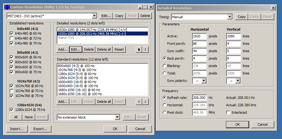 I recieved it yesterday and started testing. First thing i've noticed is my video card (gtx 980) doesn't go into idle mode (using 3 monitors) so i'm using this workaround: http://www.overclock.net/t/964370/howto-...idia-cards With that fixed i've started overclocking. I've installed CRU and NVIDIA Pixel Clock Patcher but nothing above 144Hz worked with Nvidia Inspector - Multi Display Power Saver active, my screen just turned grey. (I guess video card was clocked too low for it to maintain > 144Hz?) With Nvidia Inspector closed i've found out my limit is 202 Hz. Anything above and my desktop items start moving from side to side. The more i increase the overclock over 144Hz, the brighter the screen becomes and i'm getting faintly visible scan lines in the top right corner, but they don't bother me. My question is what's a safe overclock for this monitor? Are those scan lines a sign that the monitor can't handle the increased frequency? I'll attach my CRU settings below. Thank you. |