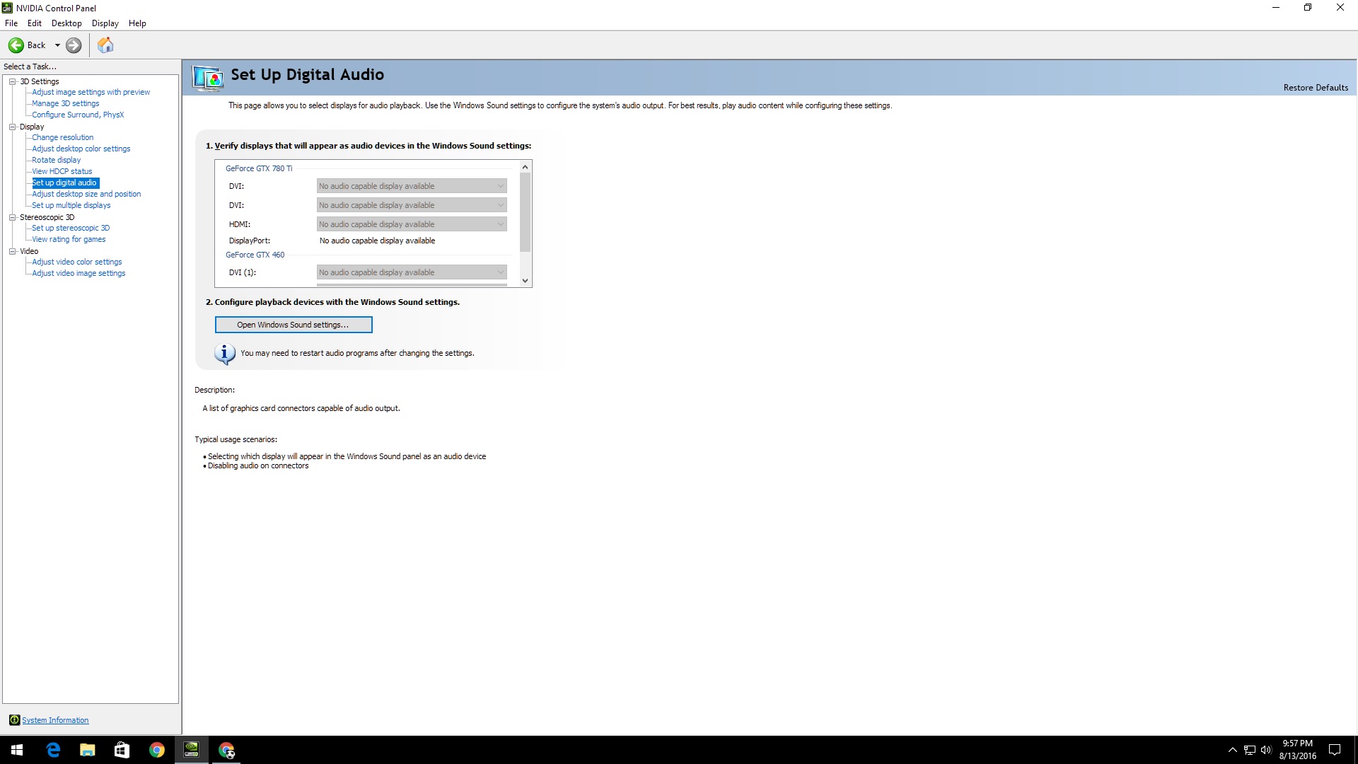 Title says it all. I have an EVGA gtx 780 ti and I use my Seiki se39uy04 as my monitor (connected using hdmi 1.4). I love having it at 120 hz at 1080p for gaming and other misc. things but it would come with the annoyance of the screen going black for a couple of seconds and then reappearing displaying the 1920x1080 resolution along with the 120hz refresh rate (this would happen about every 10-20 minutes). I followed this tutorial and this one (http://blog.ysutopia.net/?p=362) to create my own resolution and pixel timer (with even values) to get a stable 120 hz at 1080p. My screen no longer blanks! Unfortunately as I solved one problem there is another...Problem is that now I have no sound coming out my TV! In my Nvidia control panel, my connector for resolution is only recognized as DVI - PC display. How do I get it so I can keep my custom 1080p 120hz resolution but get my connector to be recognized as hdmi so I can receive sound again? Thanks