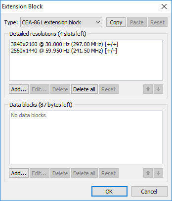 (11-28-2016 03:17 PM)Altberta Wrote: I did attach configuration files. Default/Patched DVI/DP export bin files and Patched DVI/DP screenshots.Your DP_Patched.png screenshot does not match the DP_Patched.bin file. It should not say "Default extension block" unless CRU could not read the extension block, which can happen if you edited it with the monitor disconnected, but the DP_Patched.bin file shows CRU was able to read the extension block. You can import the file to see it. You need to edit the extension block and delete the HDMI support data block because there's no reason to have that with DisplayPort. See if that helps. |
