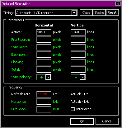 (03-09-2017 11:38 PM)ToastyX Wrote:(03-08-2017 05:01 PM)lefenzy Wrote: I have also tried putting the parameters for 960x720@75Hz from the CRU Detailed Resolutions dialog into the Intel graphics driver Add Resolution (Advanced). This makes the resolution show up among the possible options, but the monitor complains about unsupported timing when I try to use that resolution.It's possible the monitor won't accept 960x720 @ 75 Hz even if it accepts 75 Hz at other resolutions. If the monitor won't accept standard timing parameters, then it's trial and error figuring out what will work. I gave up on a custom resolution at higher refresh rate, but I have found the U2414H monitor is capable of 1920x1080 at 76 Hz max. Funnily enough, when I tried 77 Hz or 78 Hz in CRU, after restarting the driver, those refresh rates were not available to set in the display settings. I was using LCD reduced settings. |
