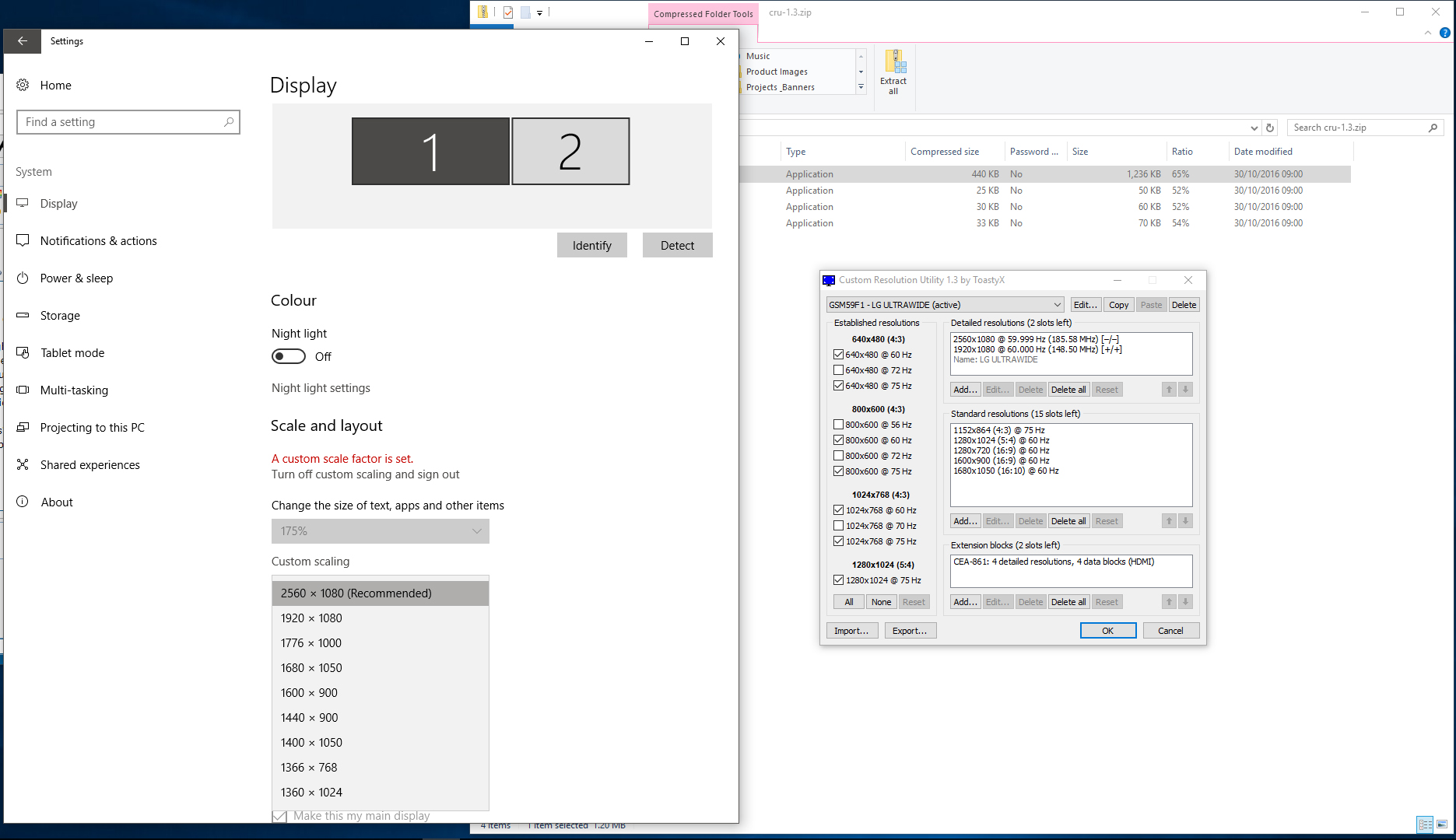 I have an issue, I was using CRU to run multiple LG Ultrawide displays (1080 x 2560), one is connected via DVI and the other HDMI. The HMDI Connected one has always worked in full res through windows display settings, but the other always tried to run 1080 x 1920 streched across the monitor. Ive been using CRU for months to run both in 1080 x 2560, but since the windows update which I installed friday, the second monitor (DVI) has gone back to displaying in streched 1080 x 1920 and i cant seem to get CRU to over ride this? Any Ideas Cheers Kieran |