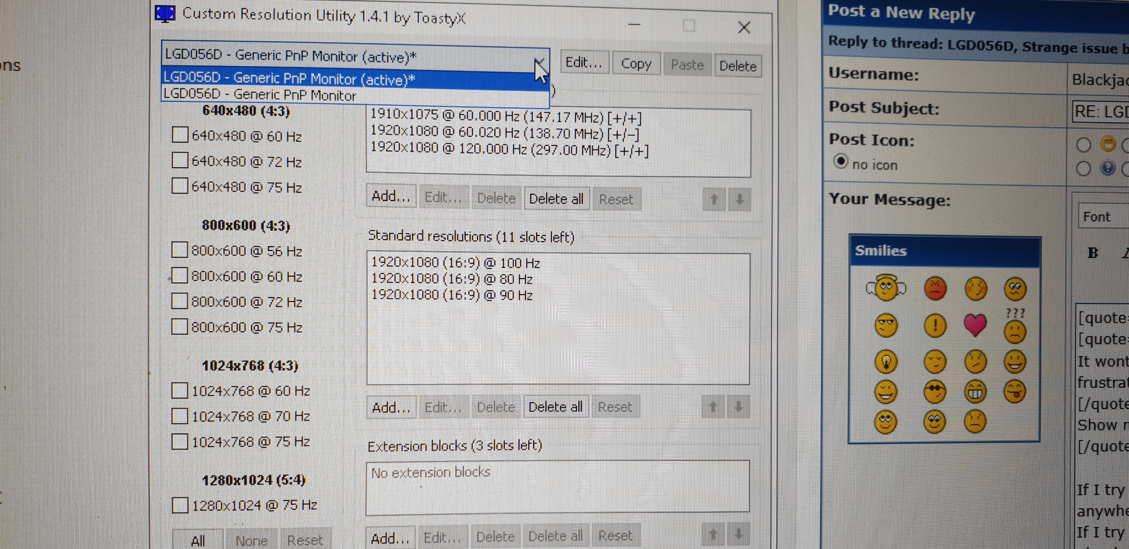 (02-07-2019 01:30 PM)ToastyX Wrote:(02-07-2019 07:09 AM)Blackjack Wrote: It wont let me add non standard resolutions or lower than 60hz, rather frustrating.Show me what you mean. What happens when you try? If I try to add it under detailed res it makes no difference it doesn't show anywhere. If I try to add under custom resolution it turns red and wont let me select ok, also it adds another monitor for some reason |