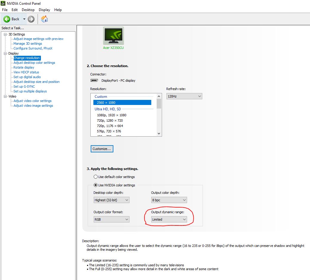 Can I make a custom output dynamic range with CRU? the two options in Nvidia control panel are full 0-255 limited 16-235 Can I use CRU to make a custom option like 30-255? See my attached picture I circled what I'm referring too. Thank you |