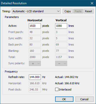 (02-14-2020 08:32 PM)benoe Wrote: I cannot find the fullhd 120Hz settings to edit (to make 120Hz work with hdmi as well) Detailed resolutions list only 60 and 144hz modes.HDMI and DisplayPort connections have different EDIDs. Are you looking at the DisplayPort EDID or the HDMI EDID (they might have different product IDs)? CRU only shows 3 extension blocks. If the detailed timing was on a fourth then it could be missing (usually 3 is enough so I doubt this is the problem). Double-check the EDIDs in Monitor Asset Manager (moninfo.exe). (02-14-2020 08:32 PM)benoe Wrote: The 144hz resolution has 325Mhz pixel clock, standard sets this to 346.55Mhz. Is it possible that this monitor cannot go this high, and that's why I cannot set the standard setting? Or should I try with better cables maybe?The display is not using a standard timing because it won't fit in the allowed range 330 MHz max (CRU should probably rename the timings to GTF, CVT, CVT-RB, CVT-RB2 so we know what standard is being used - 1920x1080 144Hz 346 MHz is CVT-RB). If the EDID comes with a 144 Hz timing using 325 MHz, then why are you creating another timing using 346 MHz? |